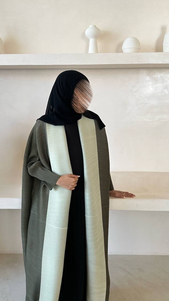 عباية مصممة من قماش البوليستر بكسرات أنيقة وتصميم مفتوح. ملاحظة: عند كيّ العباية بالبخار وتعليقها بشكل طولي قد يزداد طولها، لذا يُرجى تجنب ذلك.