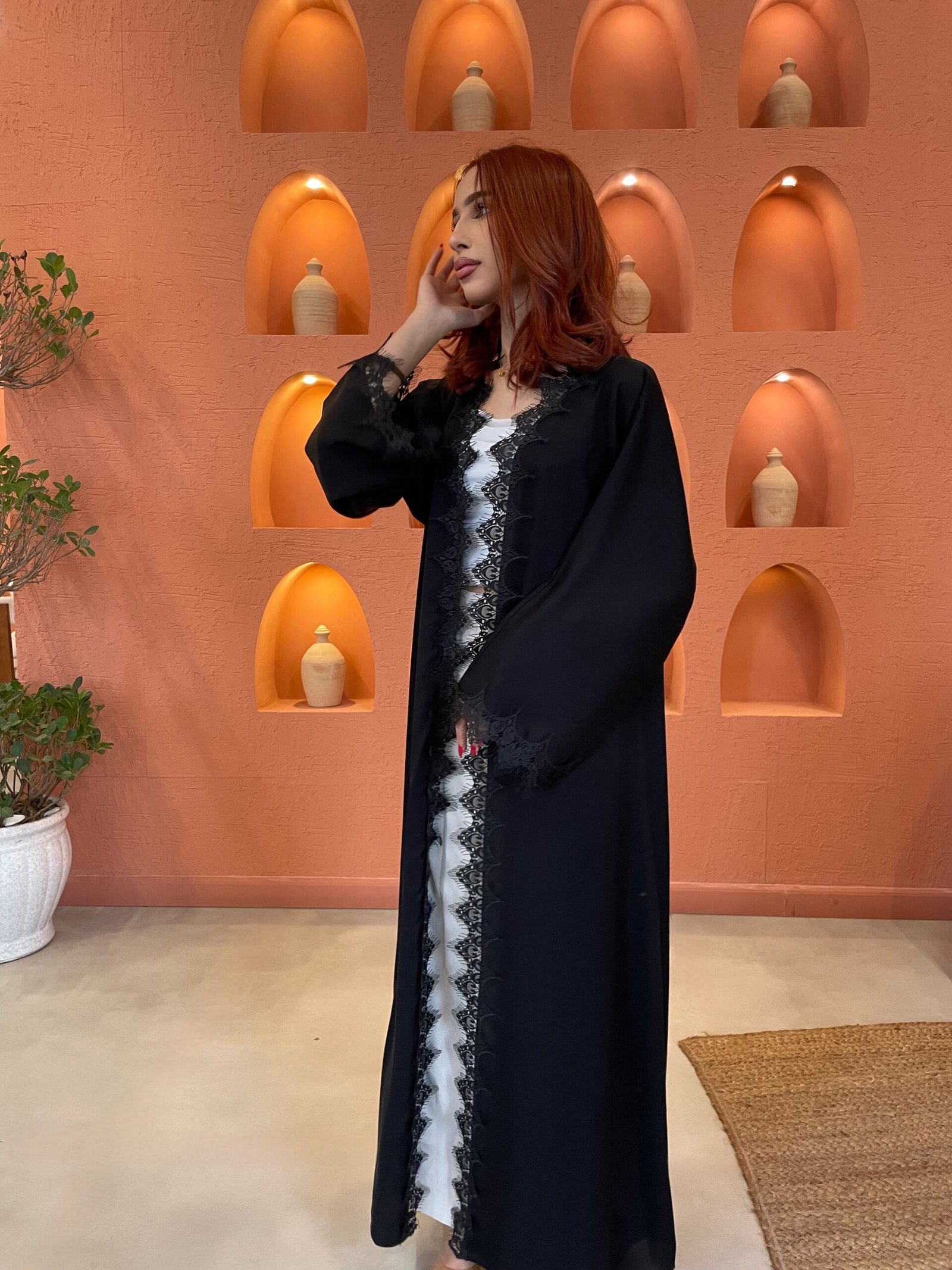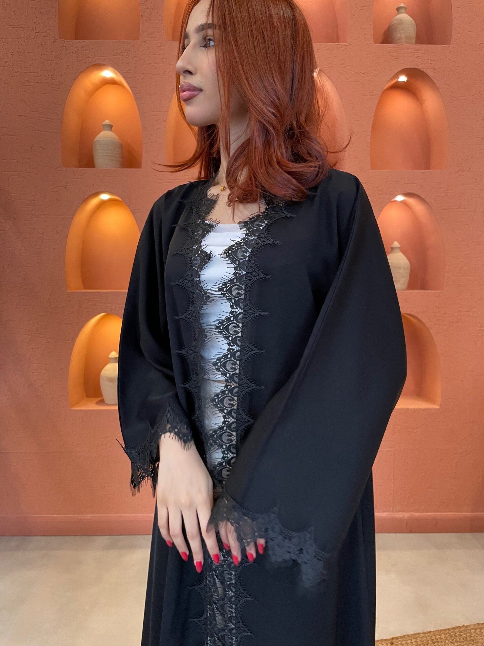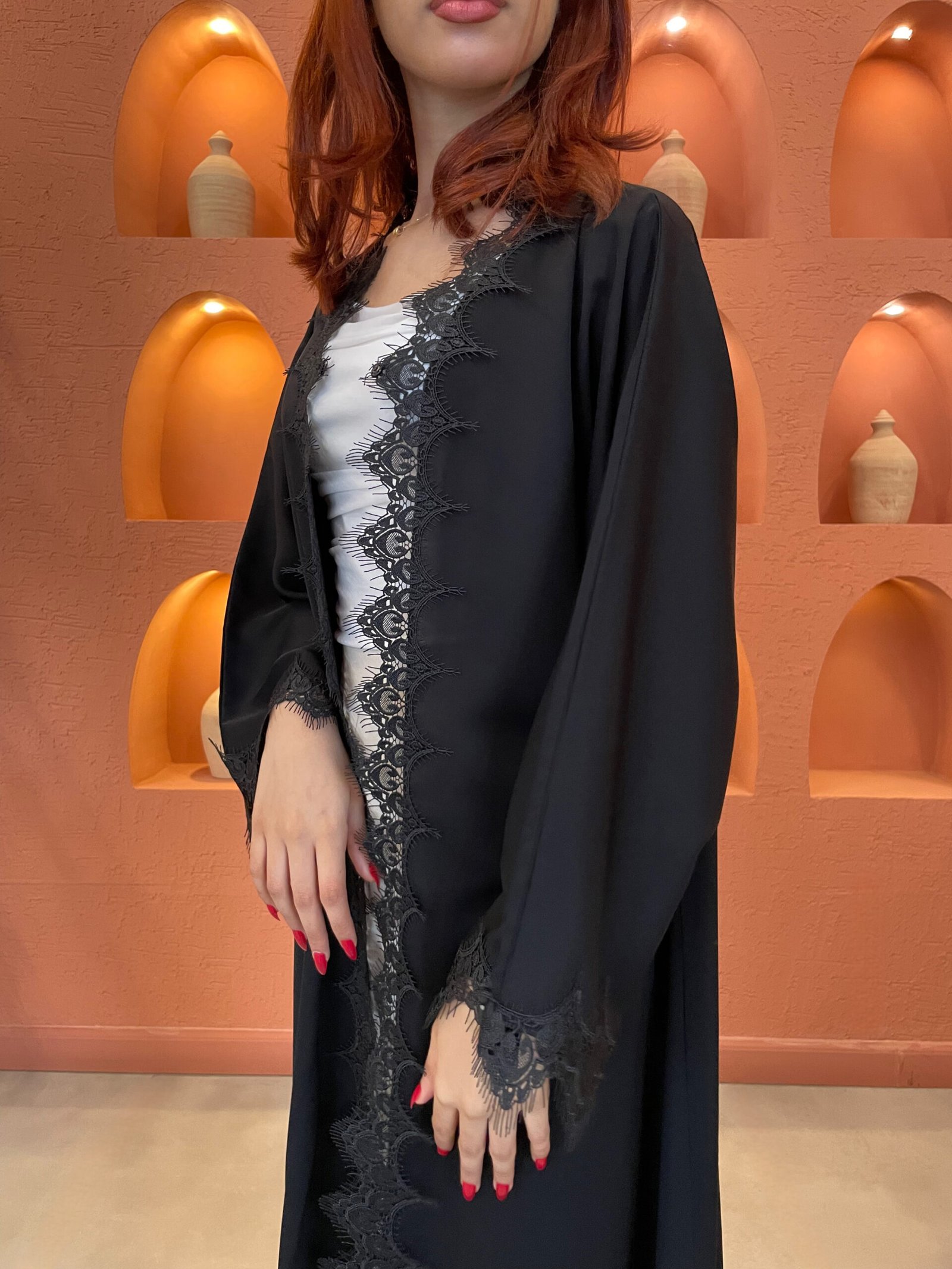 عباية أنيقة من قماش ندى بتفاصيل دانتيل في المنتصف والأكمام تضيف لمسة راقية.