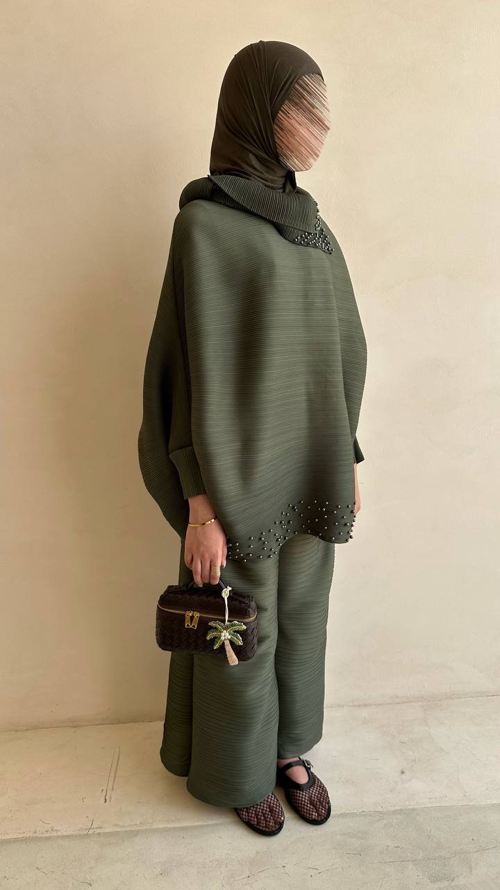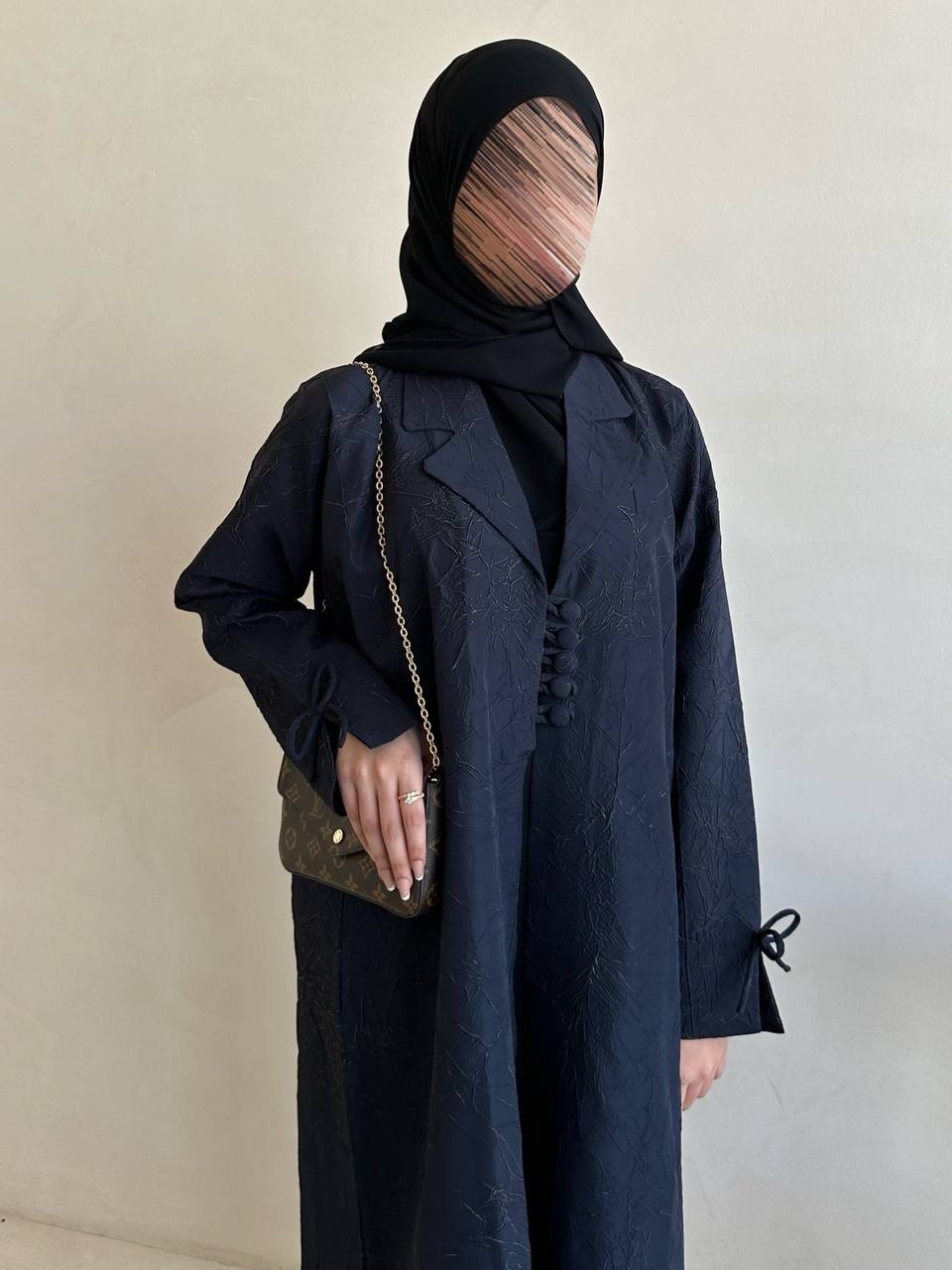 عباية مصنوعة من قماش ندى بتصميم بليزر أنيق، مزوّدة بأزرار تضيف لمسة عملية وعصرية.