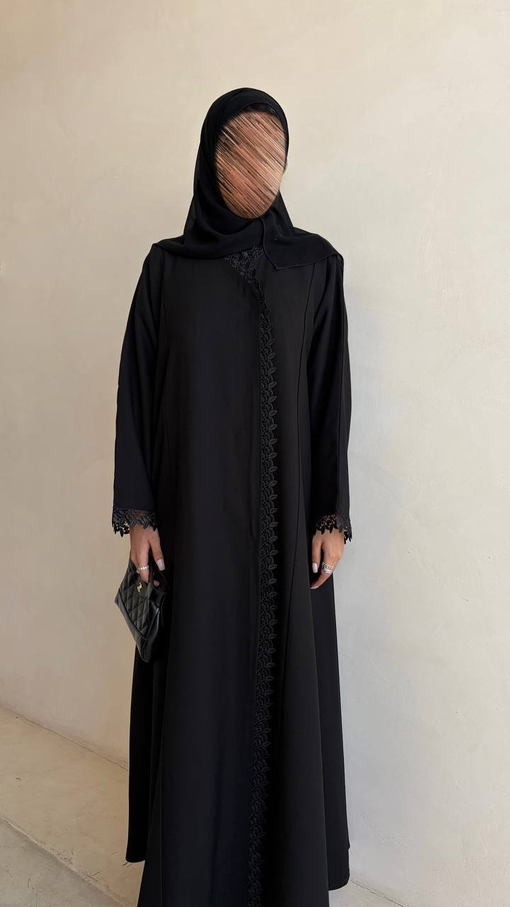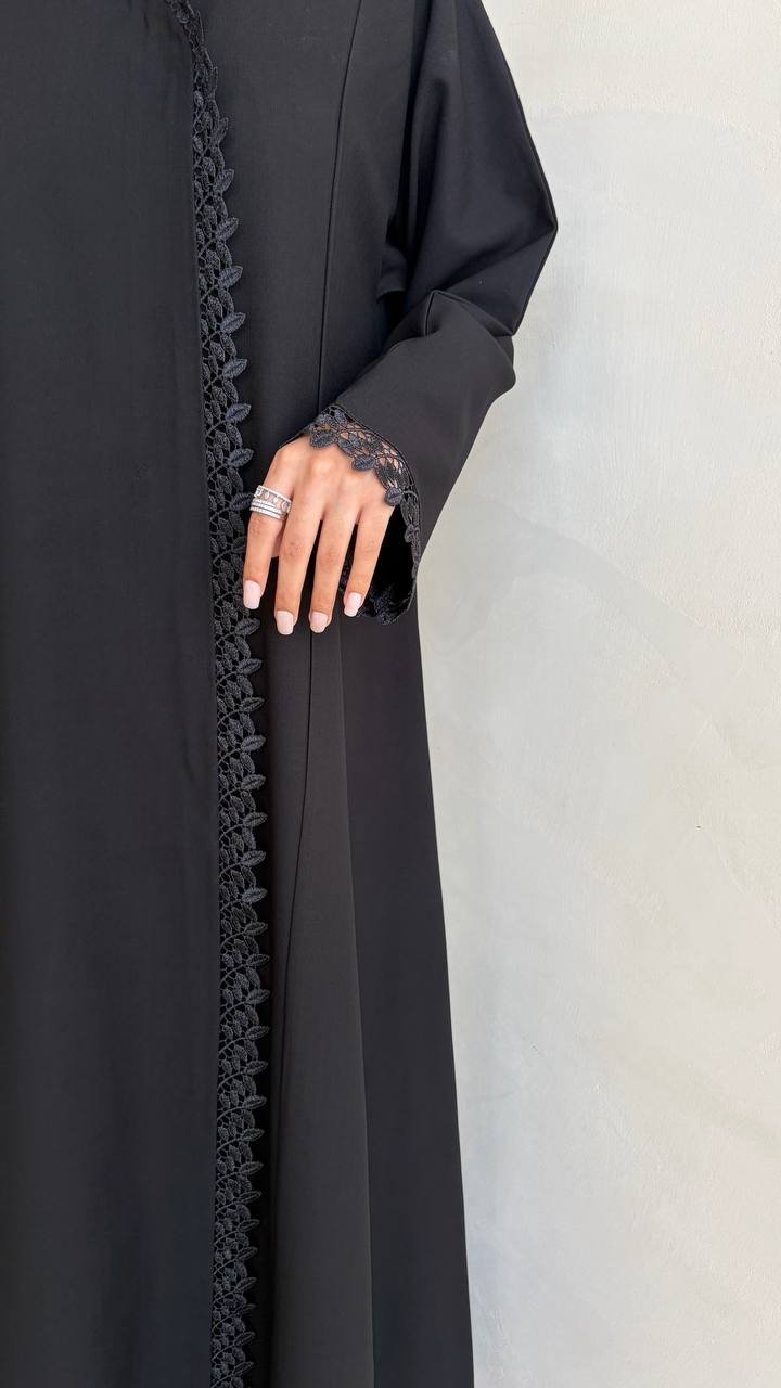 عباية بتصميم كلوش مع دانتيل على الجانب و ازرا