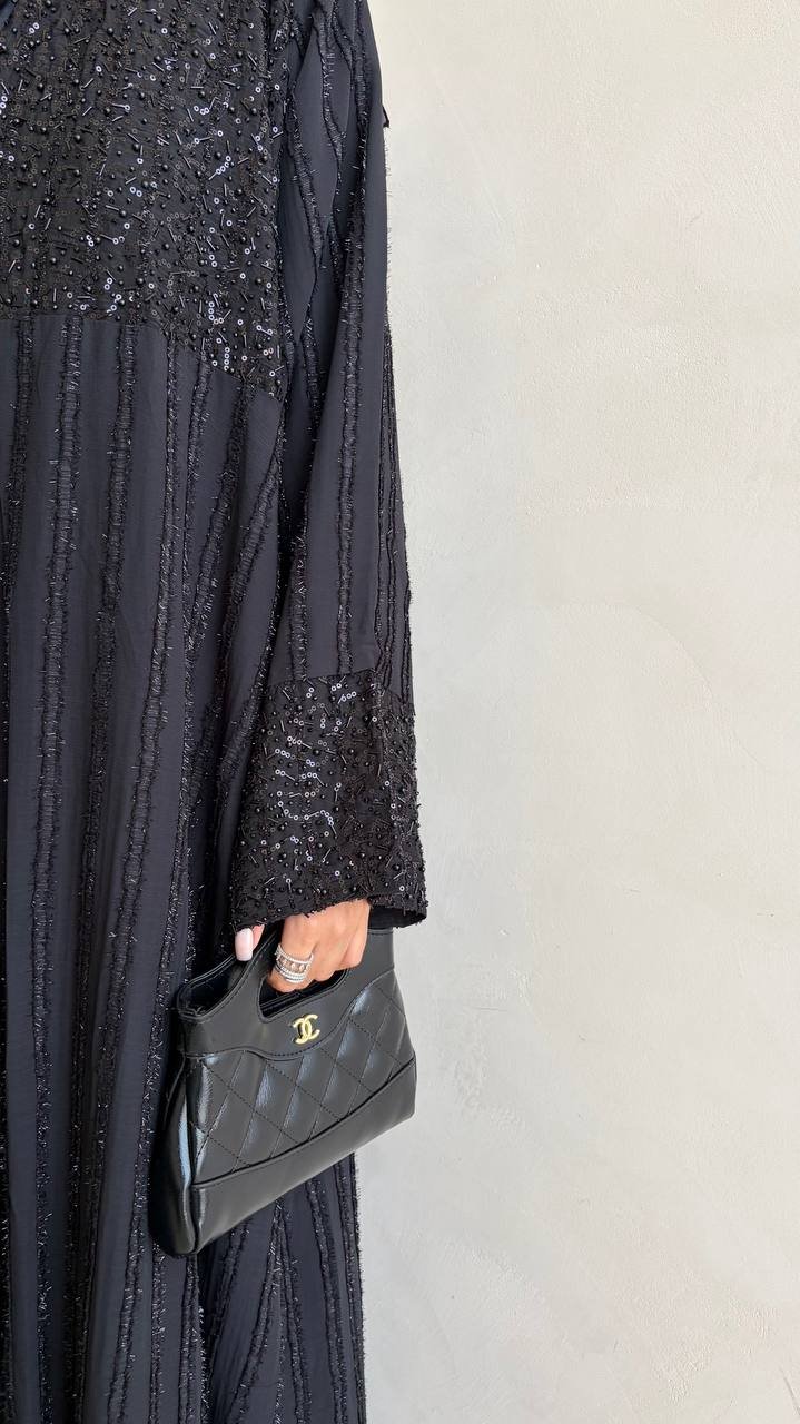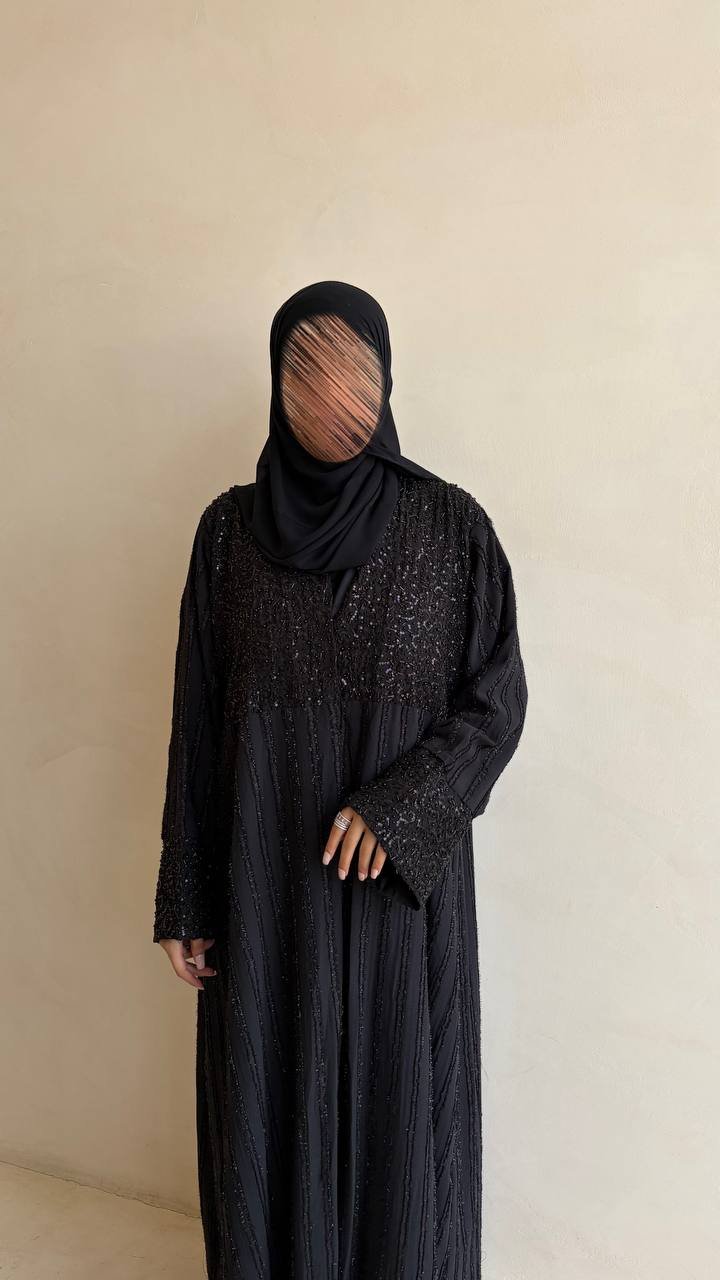 عباية بتصميم أنيق مزينة بتفاصيل شك فاخرة على الأكمام والصدر، تمنحك إطلالة راقية تجمع بين البساطة والتميز.