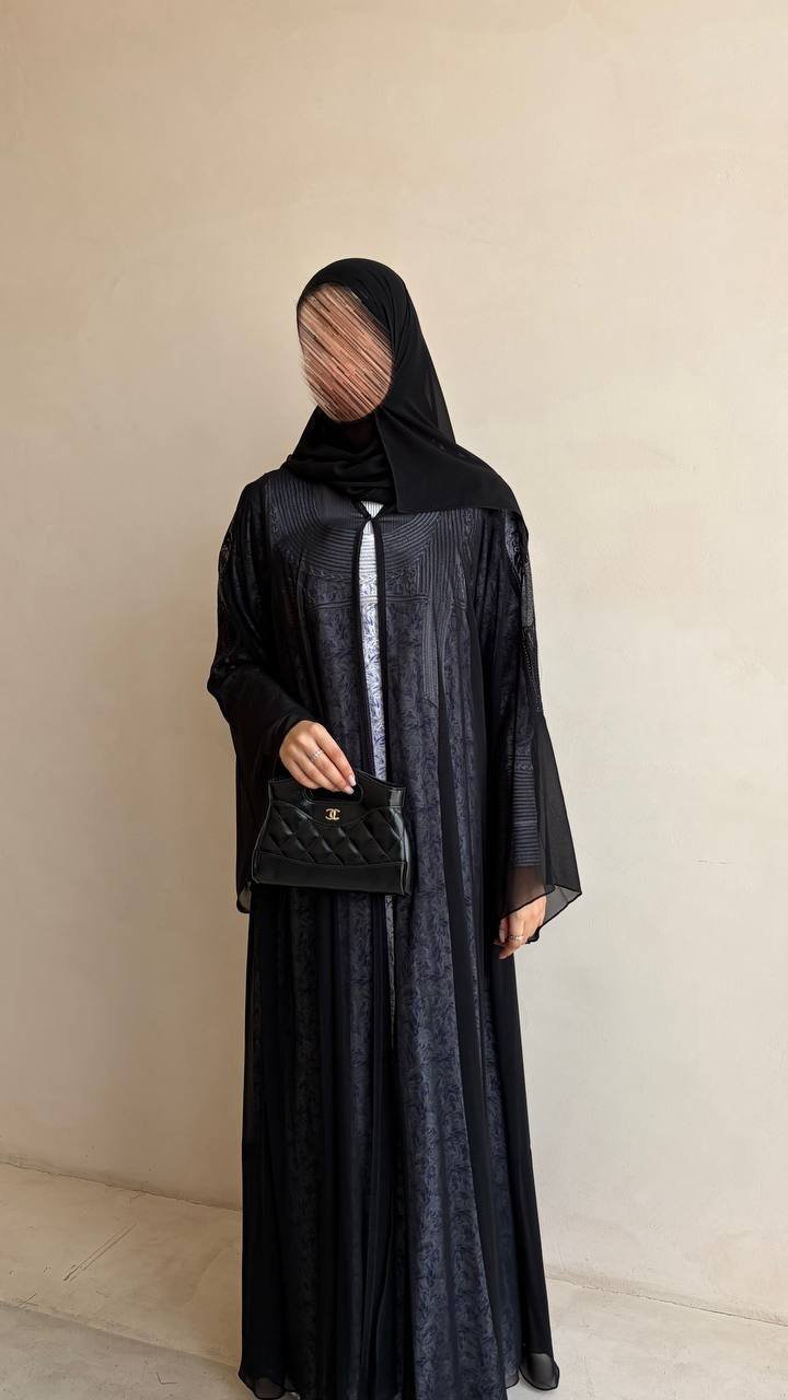 عباية بقماش شيفون فاخر بتصميم أنيق، مزينة بتفاصيل خرز ودانتيل راقية على الظهر، مع أكمام فرنسية تضيف لمسة فخمة وأنثوية ناعمة لإطلالة راقية ومميزة.