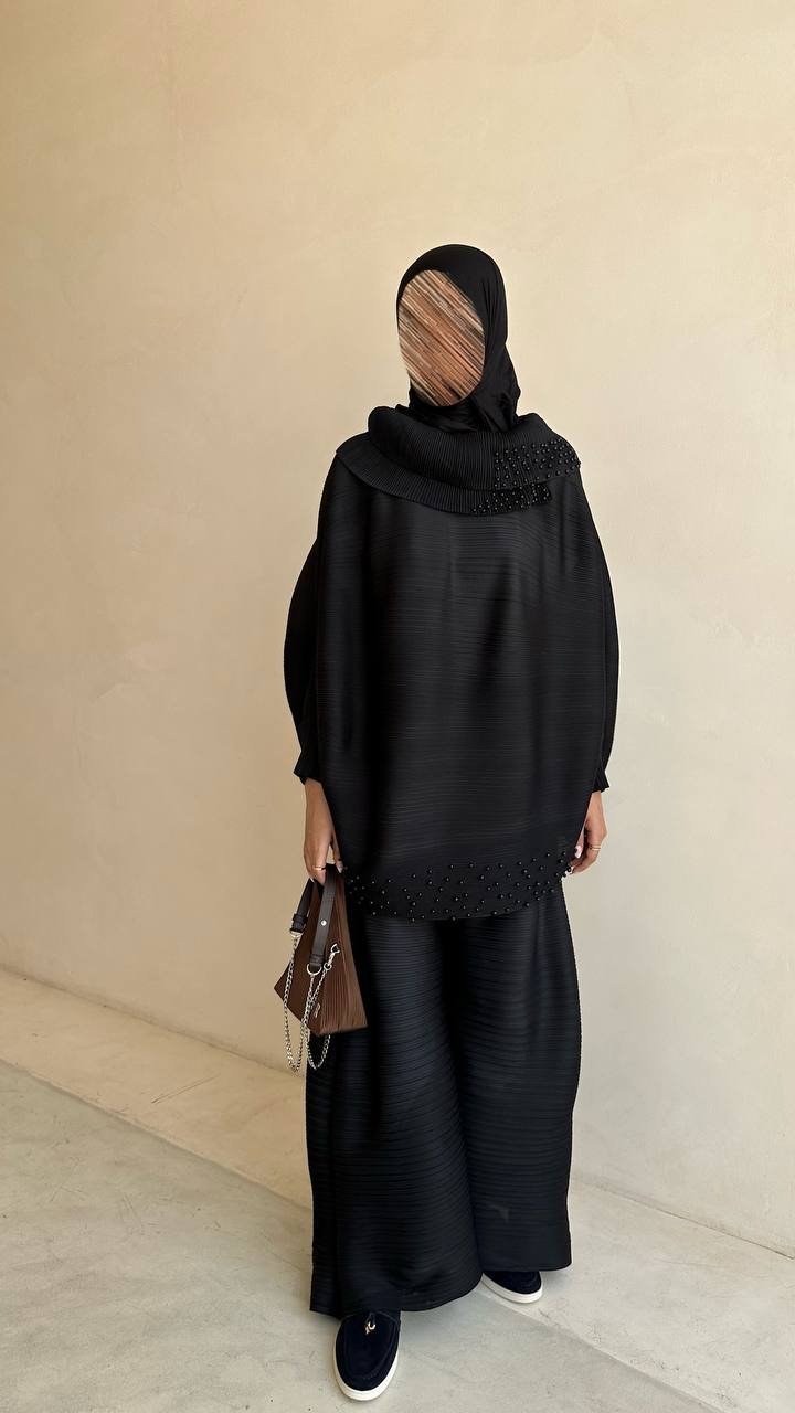 بدلة مصنوعة من قماش بوليستر بتصميم ساتر وأنيق، تجمع بين الراحة والمظهر الراقي.