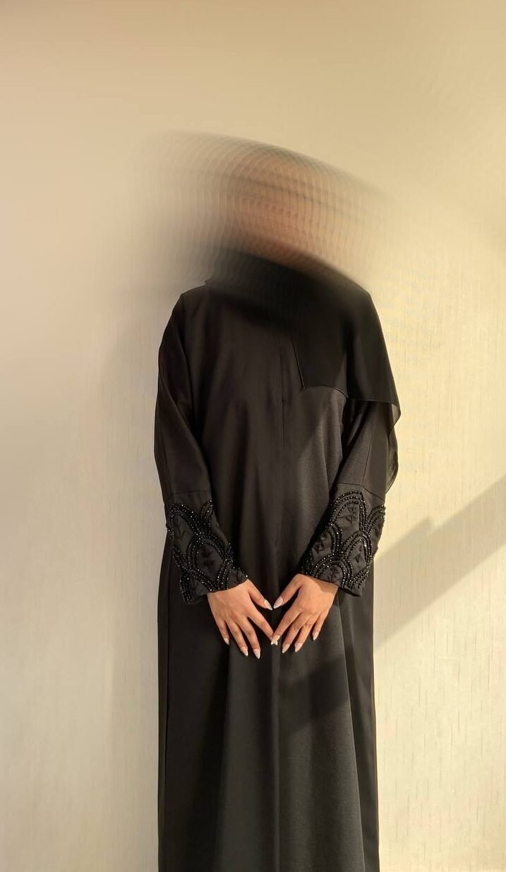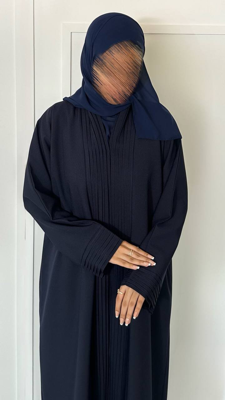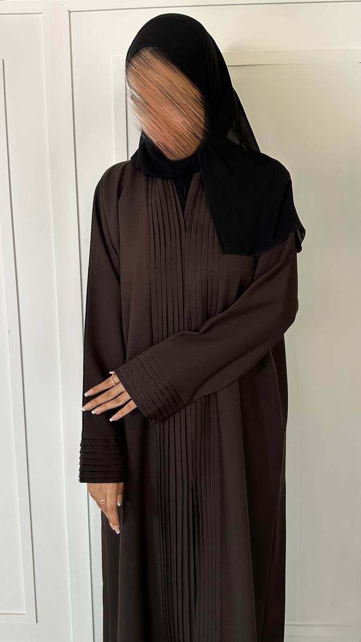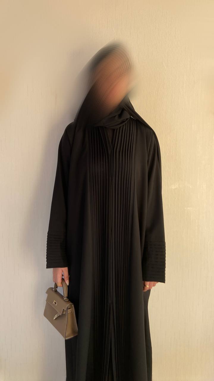 A Fowah fabric abaya with pleated detailing on the sleeves and at the center, with buttons.