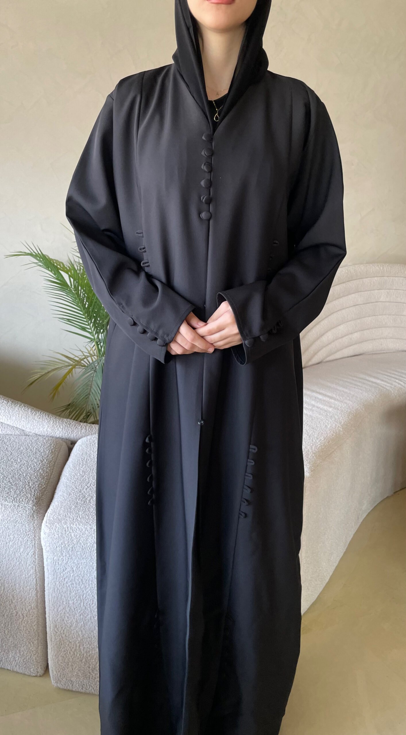 A luxurious Barbie-fabric abaya featuring elegant button details on the sleeves and along the full length.