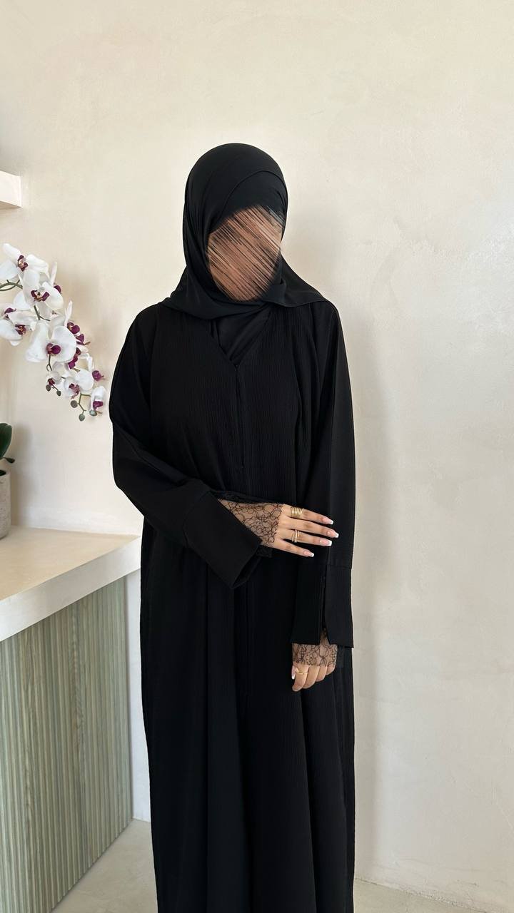 An abaya crafted from a practical, wrinkle-free fabric, featuring elegant lace detailing on the sleeves and finished with buttons for a refined look.