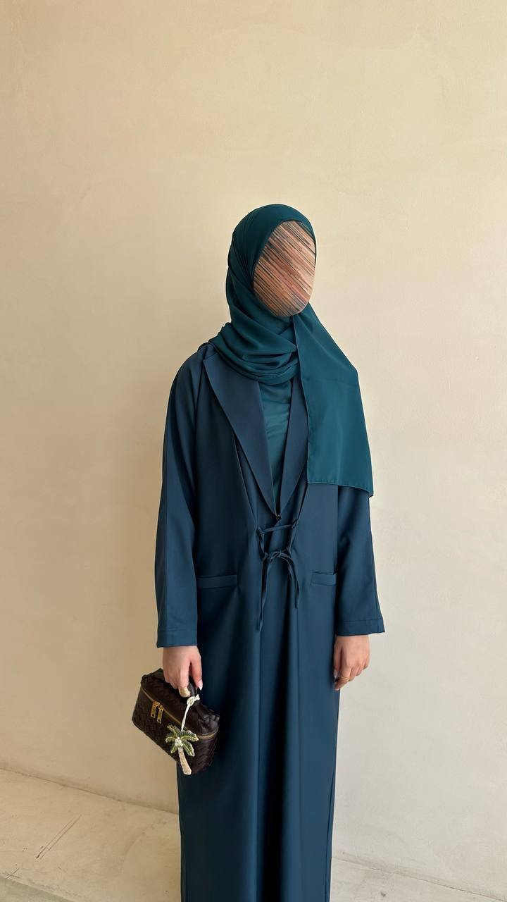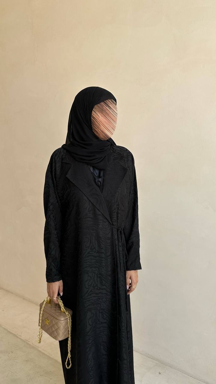 A blazer-style abaya crafted from Barbie fabric, featuring a tie detail that adds a feminine touch and enhances the overall elegance.
