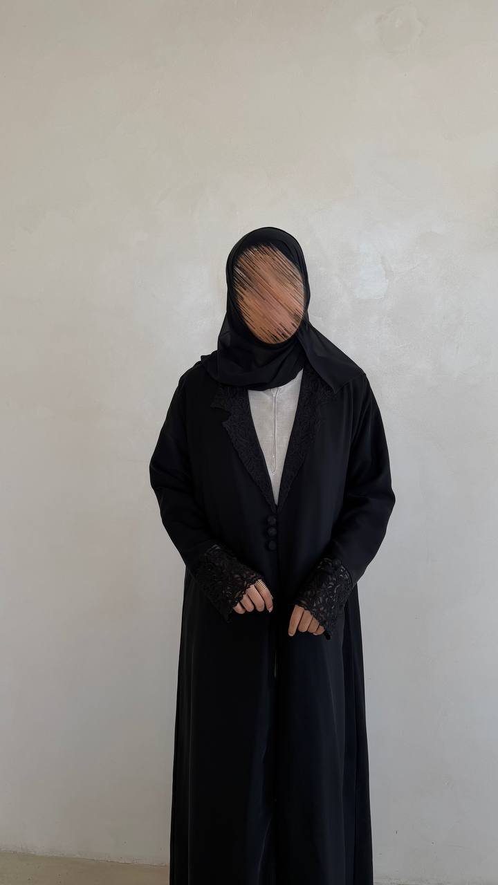 An abaya crafted from Nada fabric, featuring elegant lace detailing on the neckline and finished with buttons for a refined and cohesive look.
