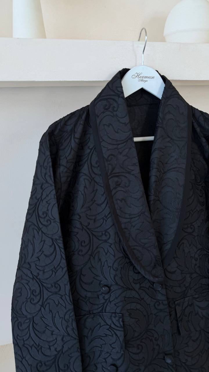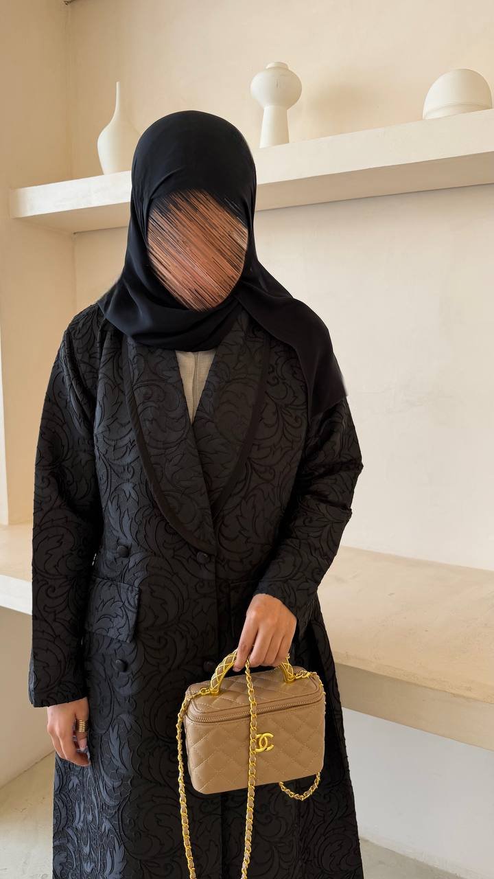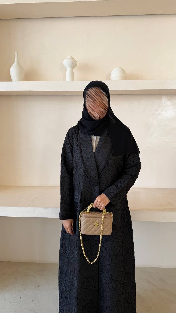 An abaya crafted from printed fabric, featuring an elegant blazer-style design and finished with buttons for a modern, refined look.