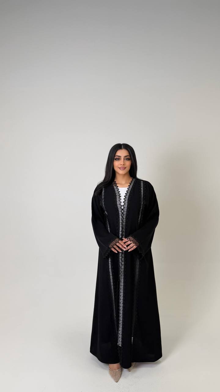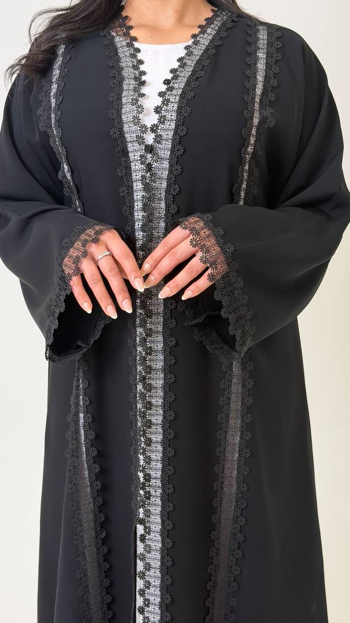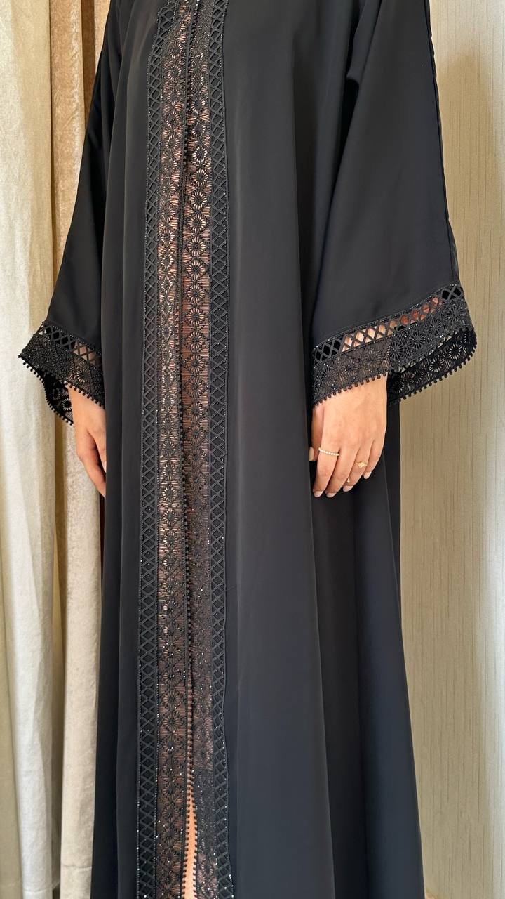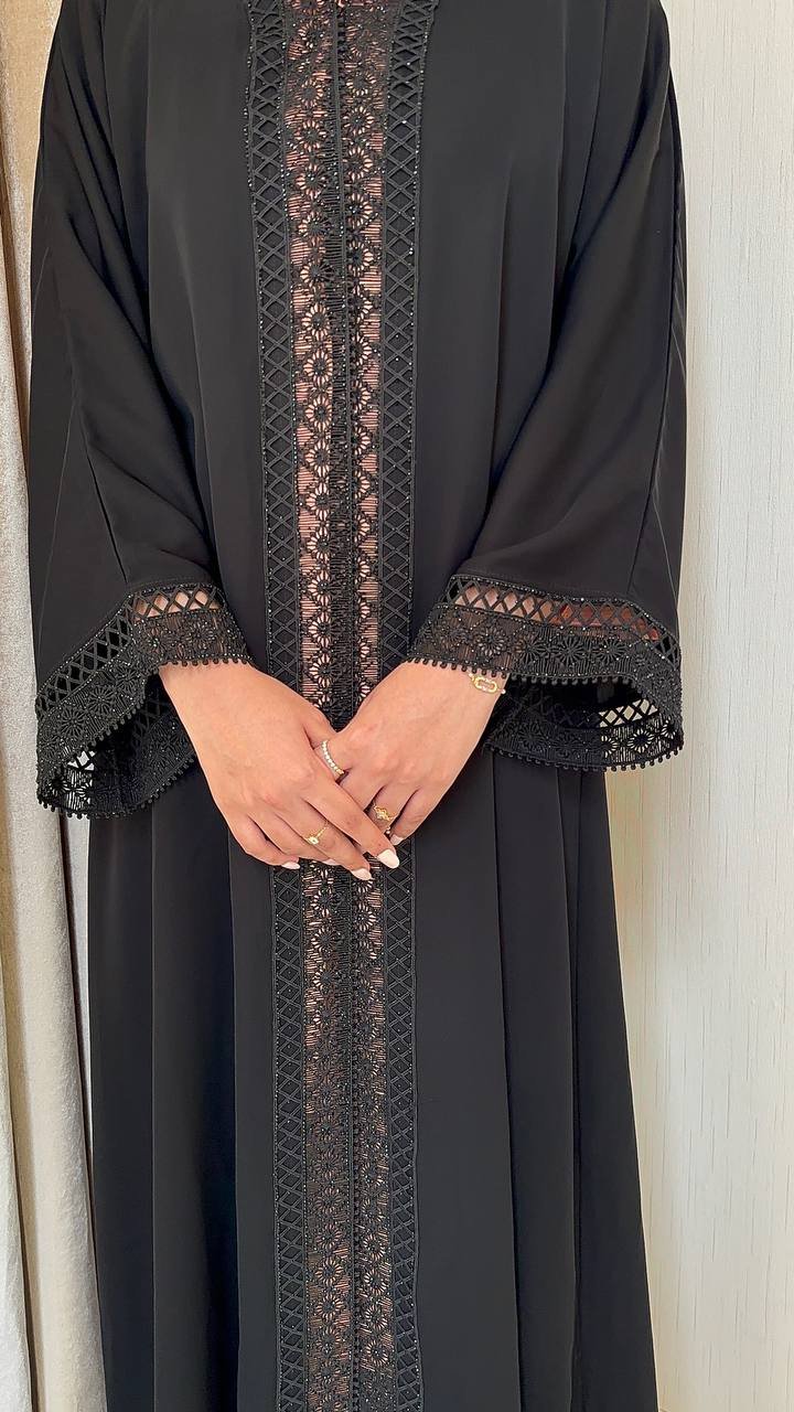 An abaya crafted from Korean Nada fabric, featuring lace detailing on four sides at the front, and finished with buttons for closure, offering a refined and elegant look.