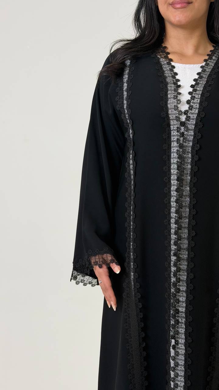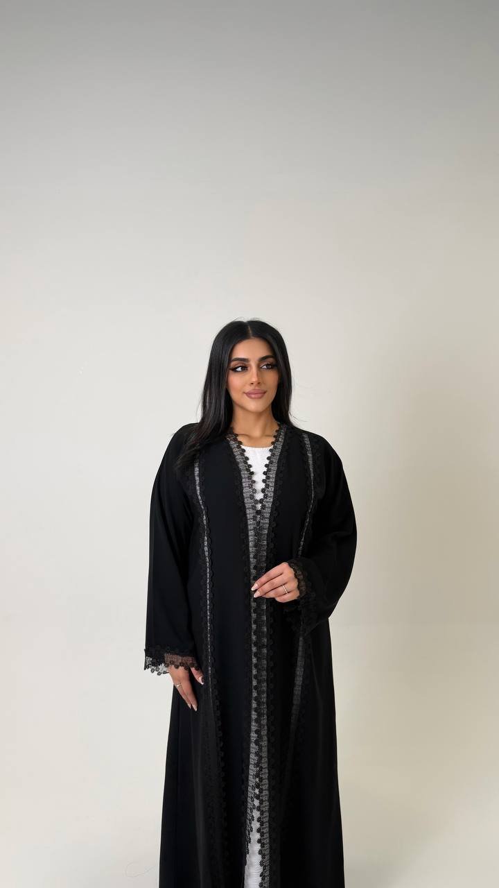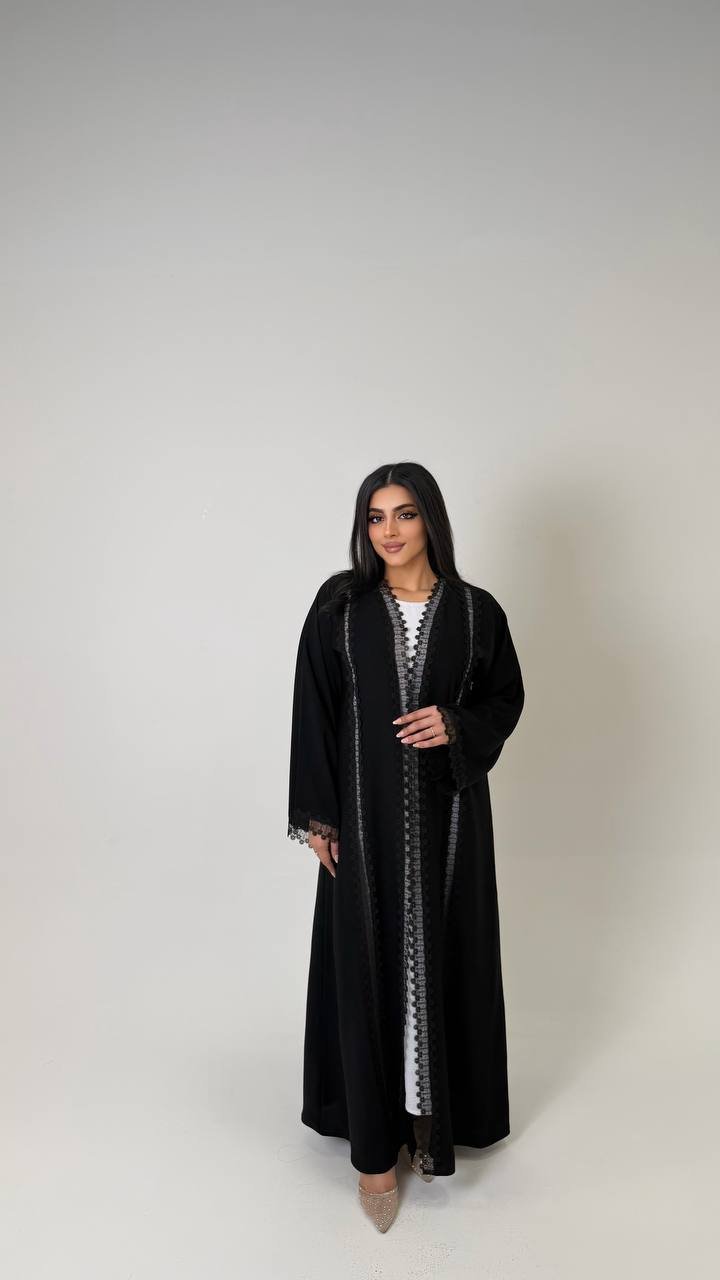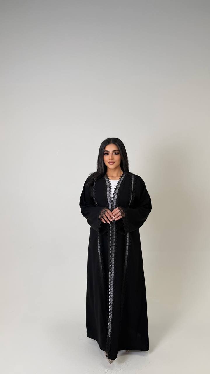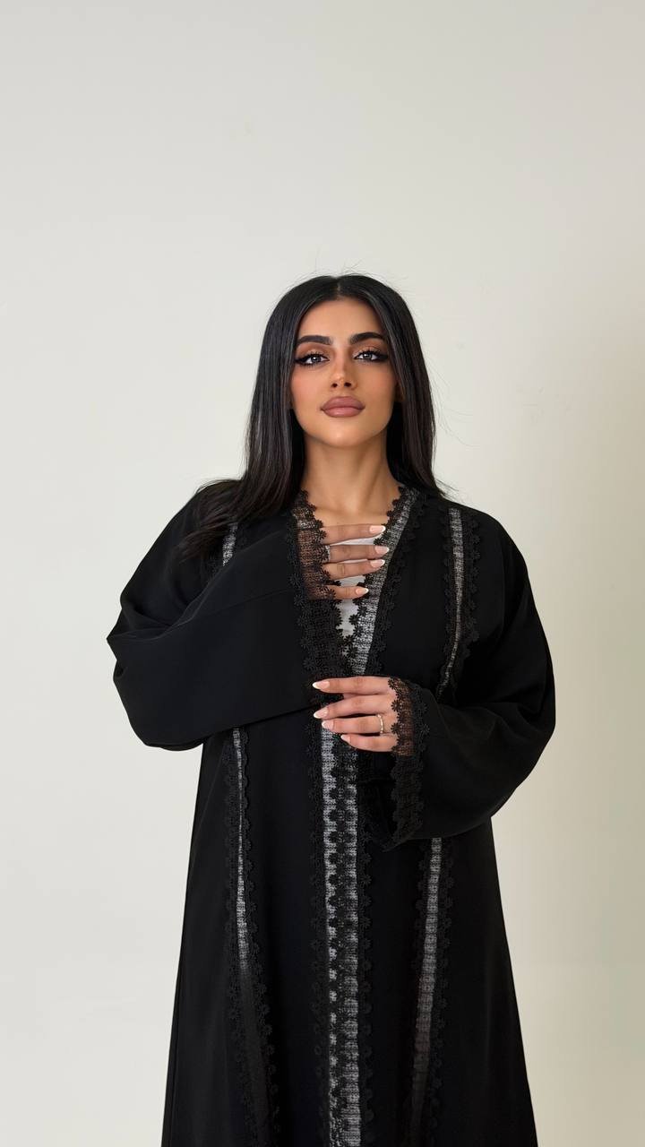 An abaya crafted from Korean Nada fabric, featuring lace detailing on four sides at the front, and finished with buttons for closure, offering a refined and elegant look.