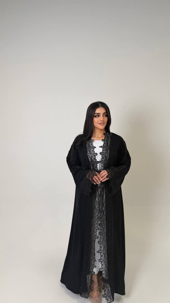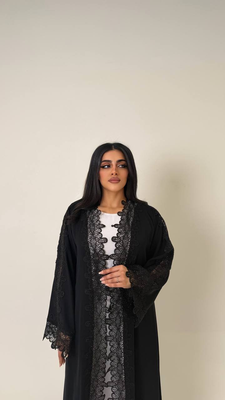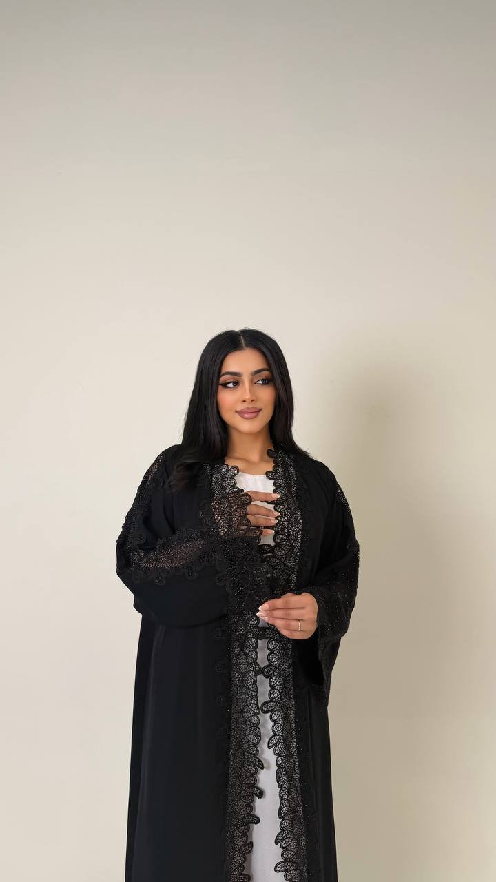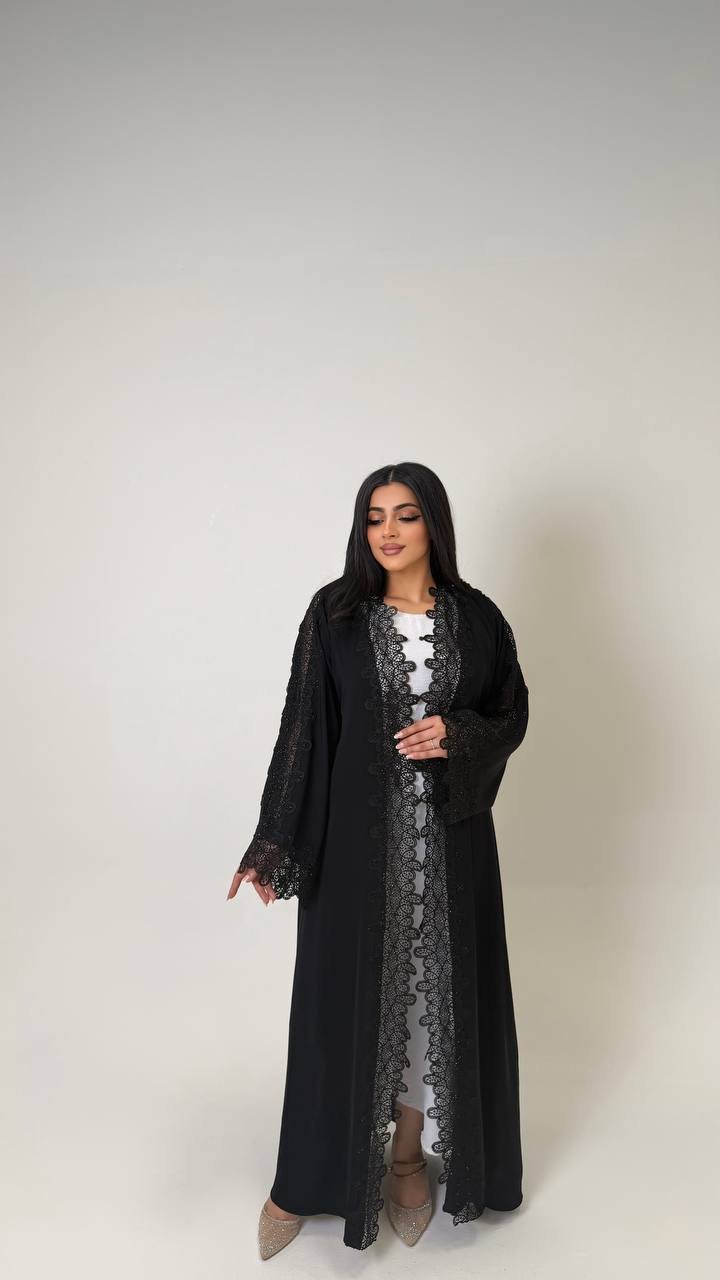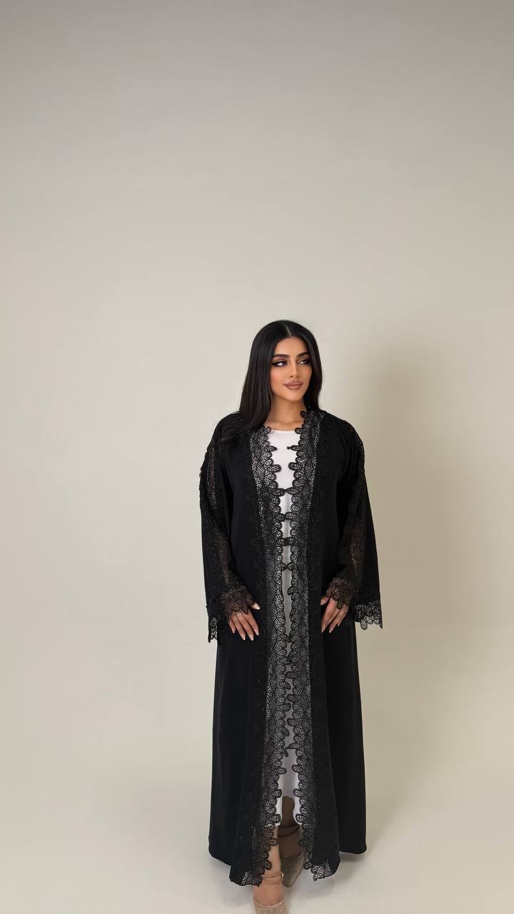 An abaya crafted from Korean Nada fabric, featuring elegant lace detailing and finished with buttons for a refined and cohesive look.