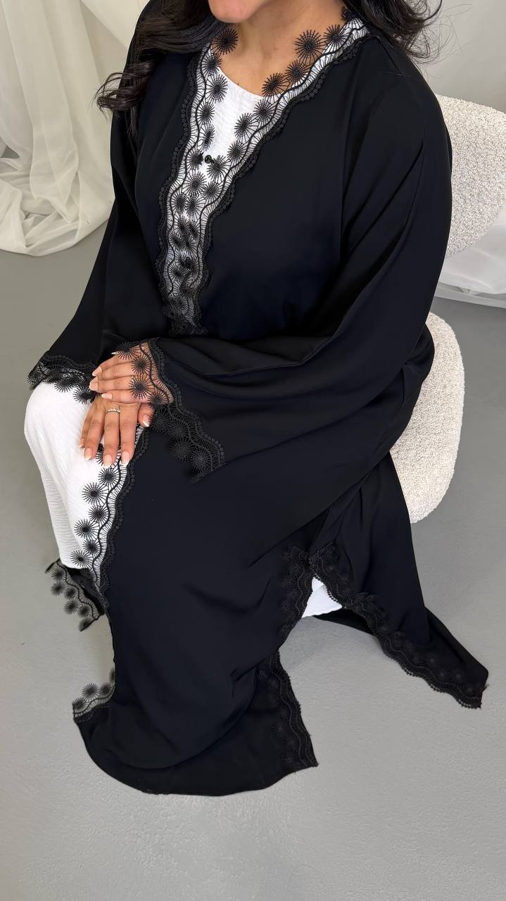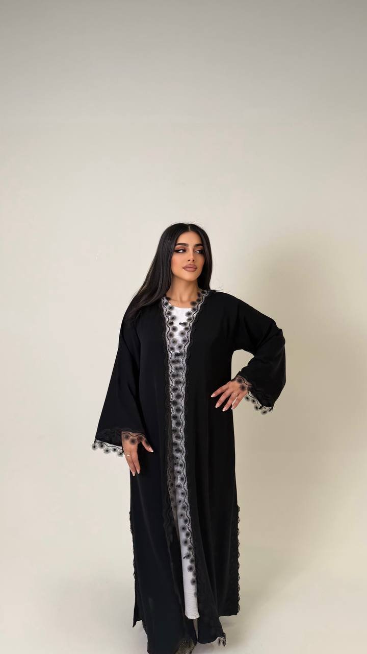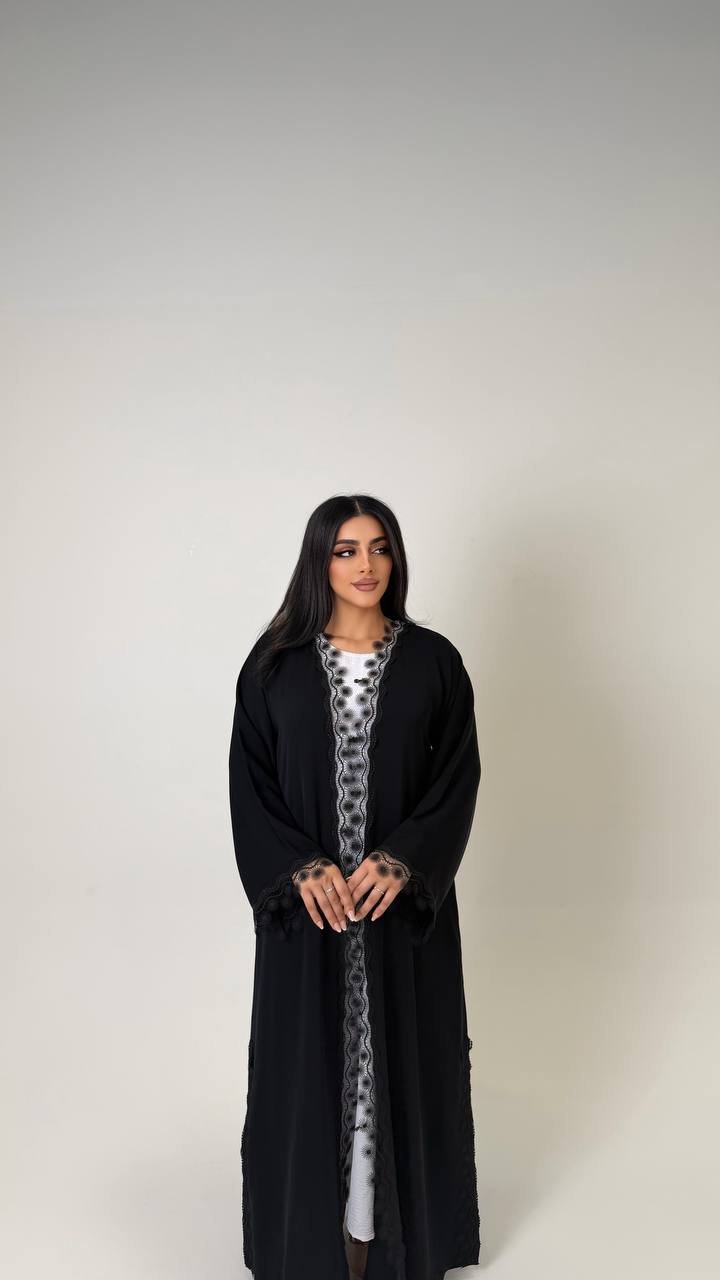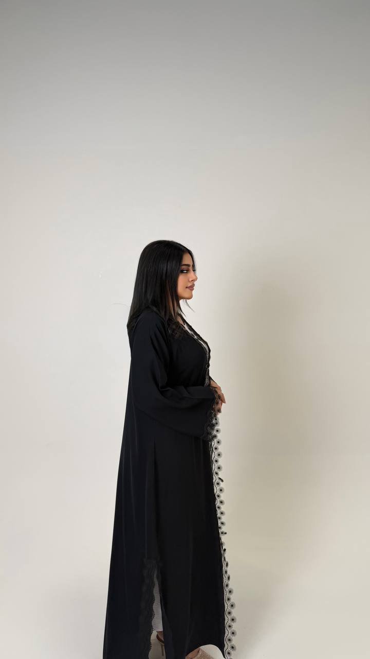 An abaya crafted from Korean Nada fabric, featuring elegant lace detailing and finished with buttons for a refined and cohesive look.