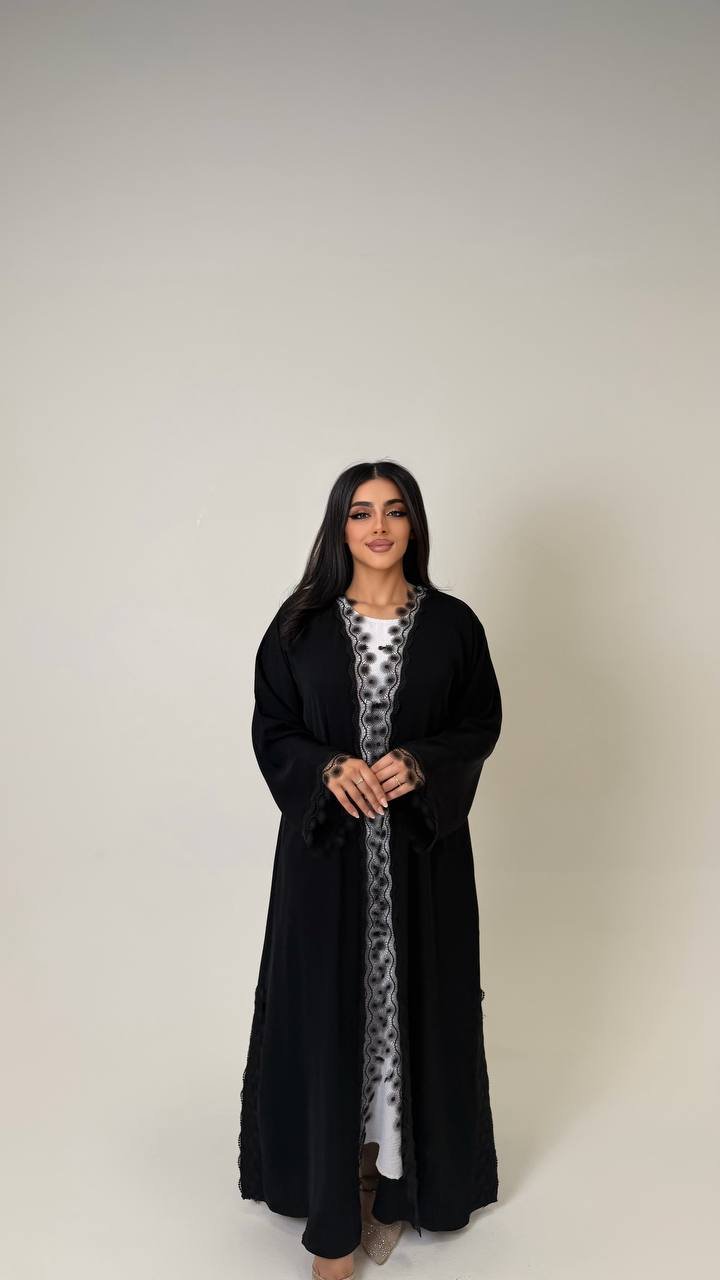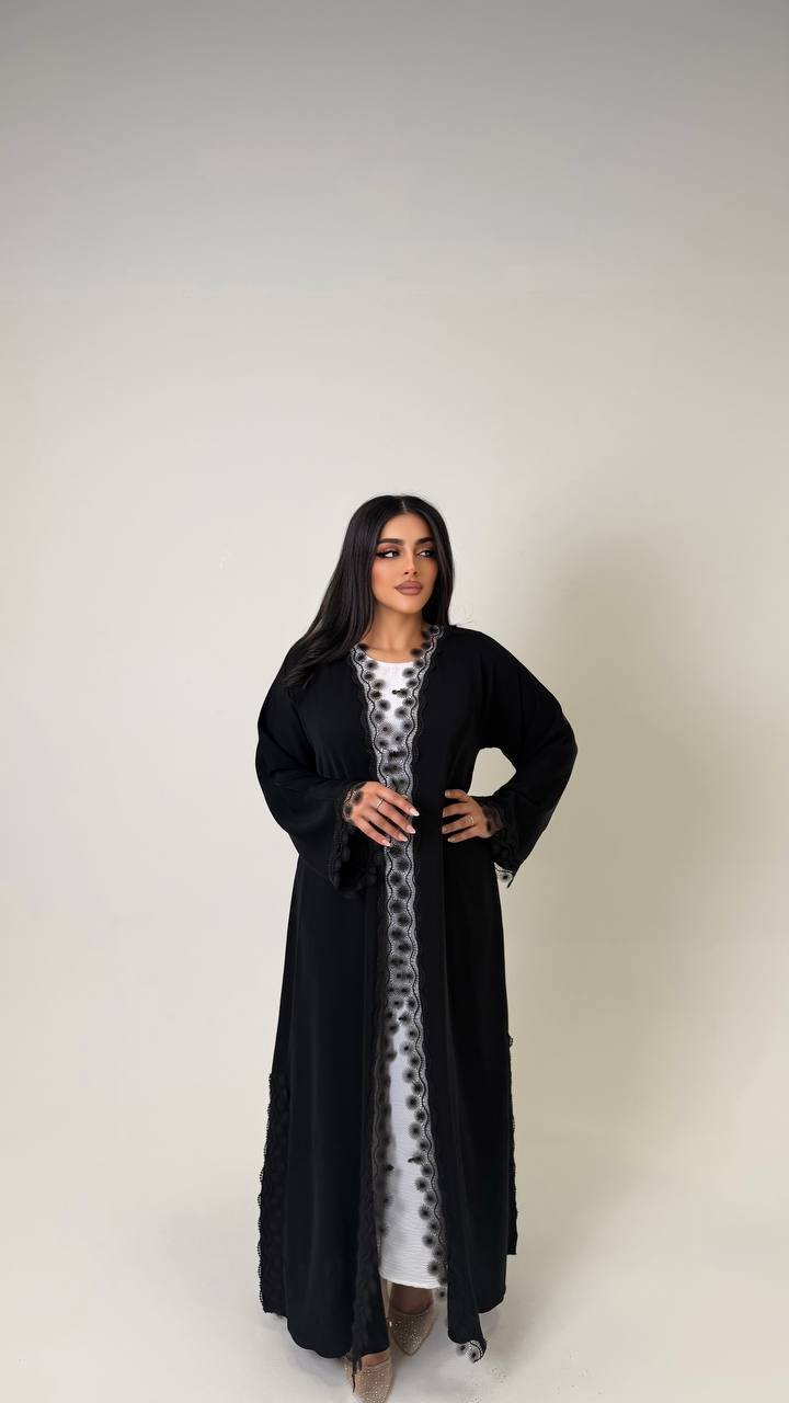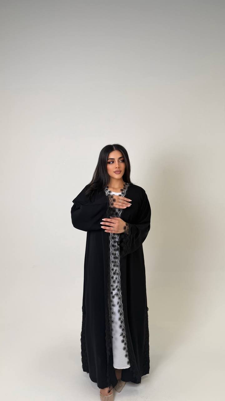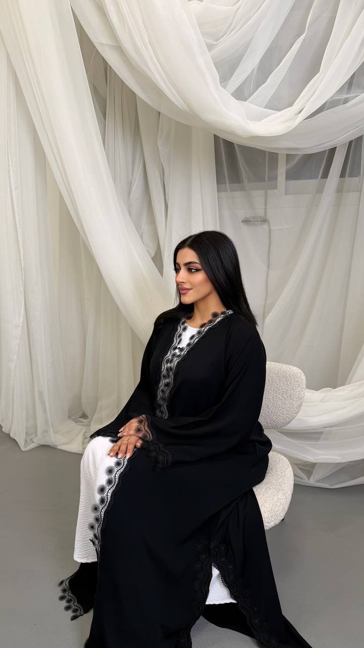 An abaya crafted from Korean Nada fabric, featuring elegant lace detailing and finished with buttons for a refined and cohesive look.