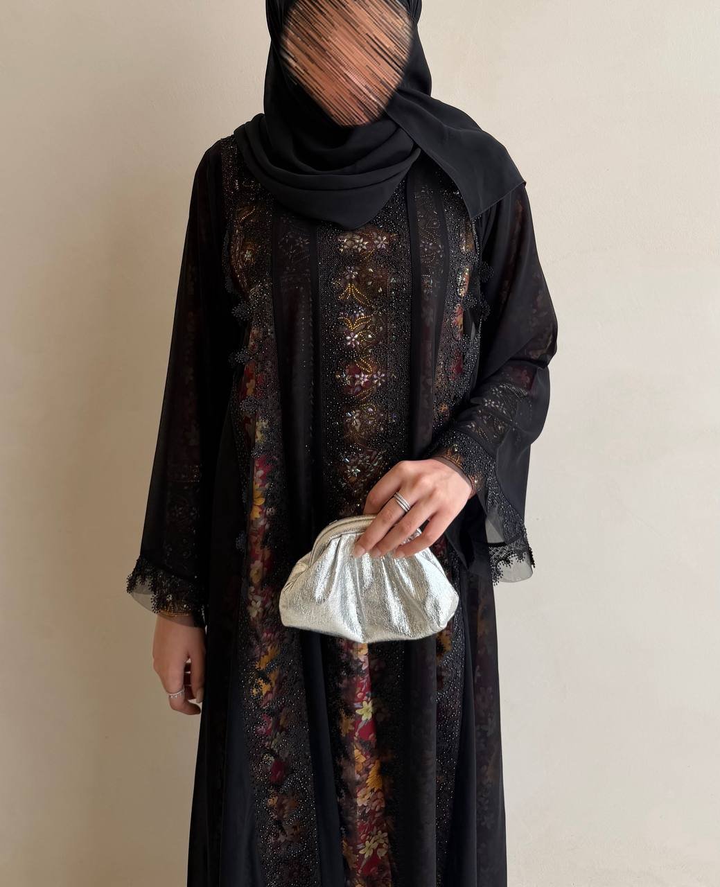 Abaya made from chiffon fabric, featuring lace and black embellishments on the front and back.