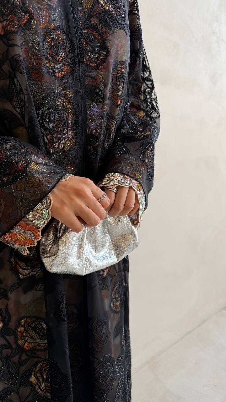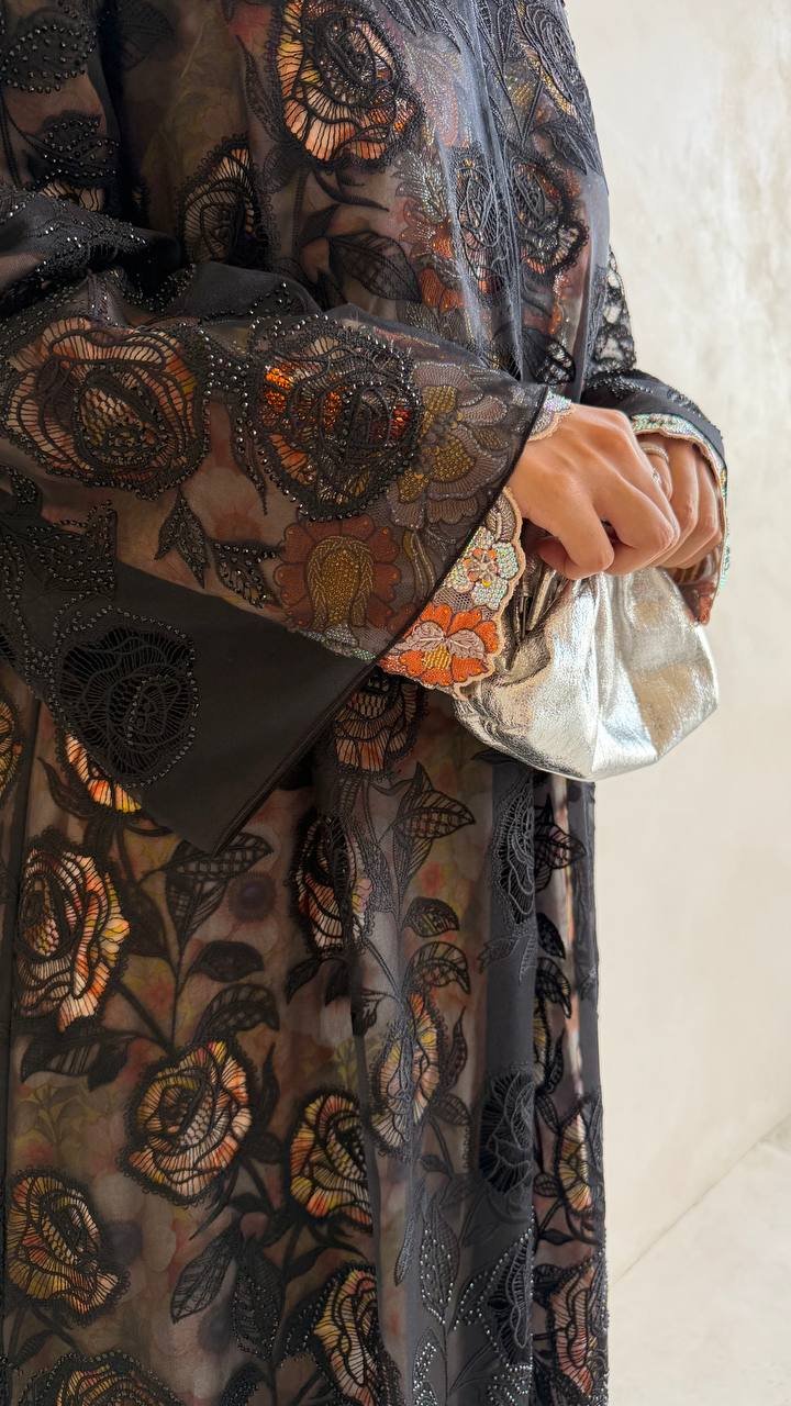 Abaya made from chiffon fabric, featuring lace and black embellishments on the front and back.